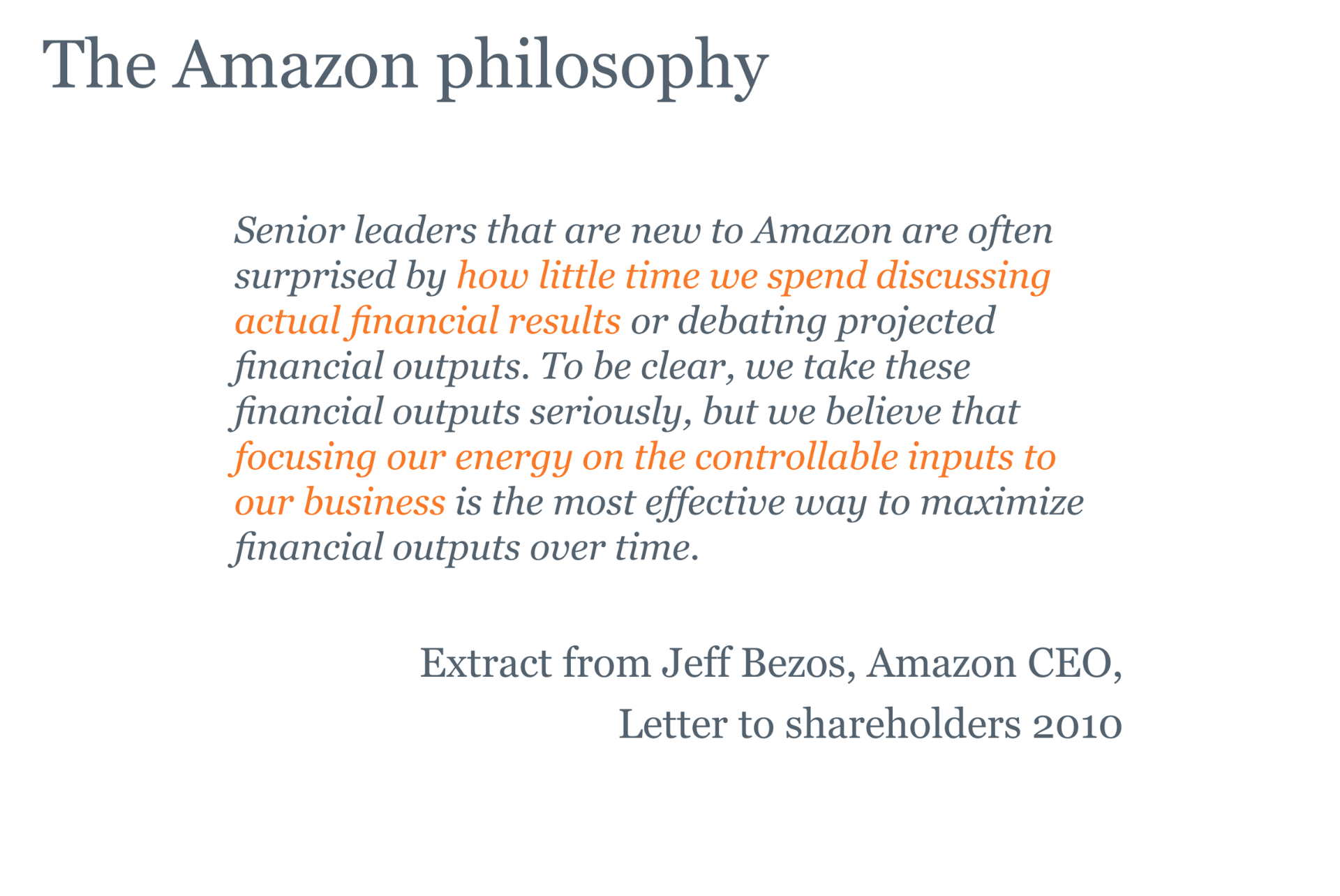 Lấy cảm hứng từ triết lý vận hành và sử dụng dữ liệu của Amazon, để tăng trưởng bền vững, doanh nghiệp cần biết mình đo cái gì (outputs) và vặn được nút nào, đòn bẩy nào (inputs), tất cả xoay quanh trải nghiệm khách hàng và một hệ dữ liệu thống nhất
